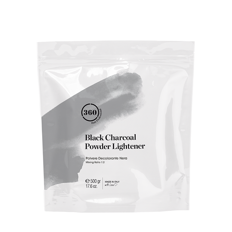 In a non-metallic bowl, mix the 360 Charcoal Powder Lightener with 360 Oxy Developer (10, 20, 30, or 40 vol) in a ratio of 1:2. Apply to dry, unwashed hair. Process for 20 to 50 minutes, checking regularly until the desired level of lift is achieved. Do not exceed the recommended processing time or use a heat source. Rinse thoroughly with lukewarm water and follow with a post-bleach treatment to seal the cuticle.