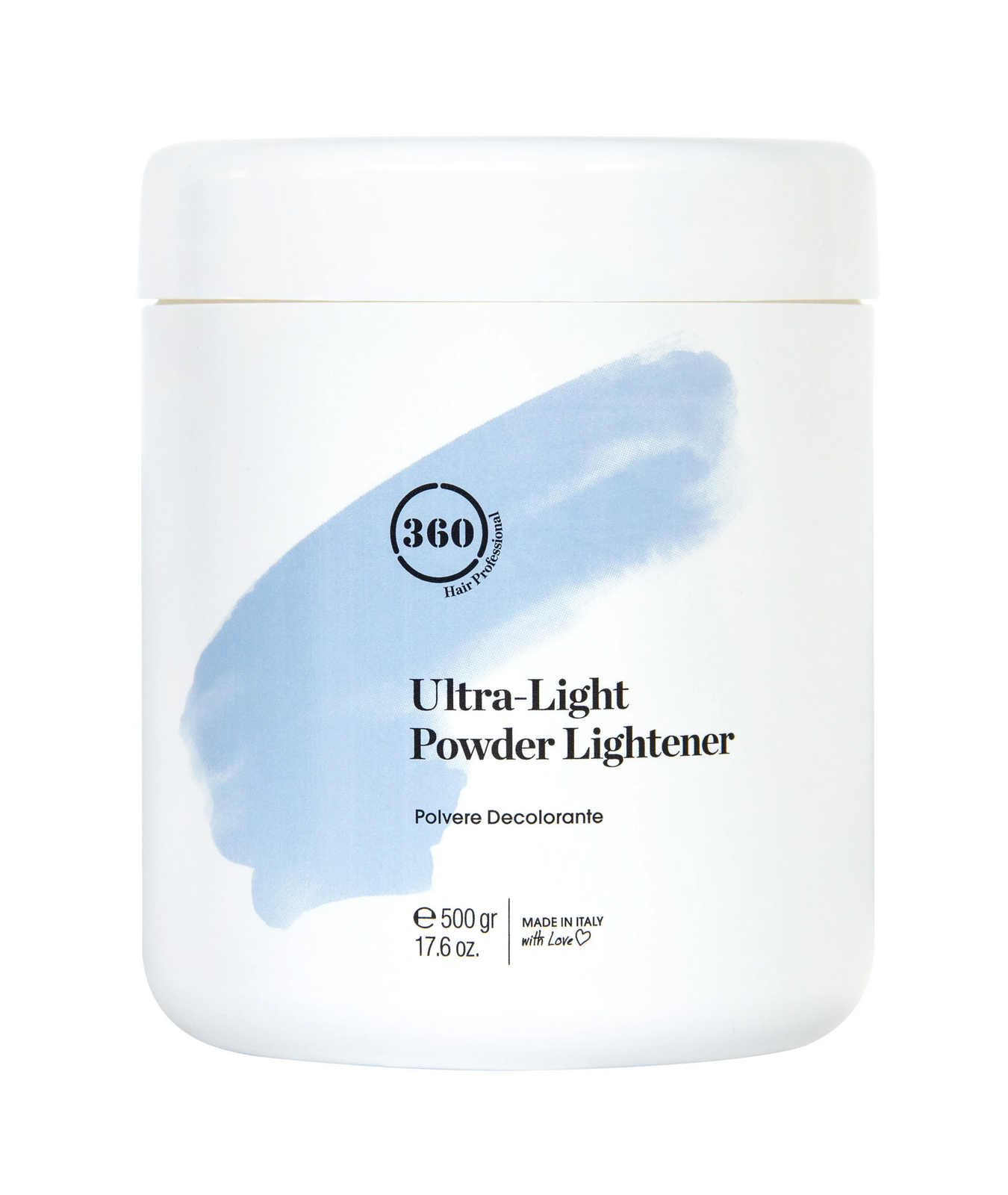 For Professional Use Only. In a non-metallic bowl, mix the 360 Ultra Light Blue Powder with the appropriate volume of 360 Cream Activator (10, 20, 30, or 40 Vol) depending on the desired level of lift. The recommended mixing ratio is 1:2. Apply to dry, unwashed hair. Process at room temperature until the desired level of lightening is reached (maximum 45-50 minutes). Do not use heat. Rinse thoroughly with warm water and follow with a post-bleach shampoo and treatment to restore the hair's pH balance.