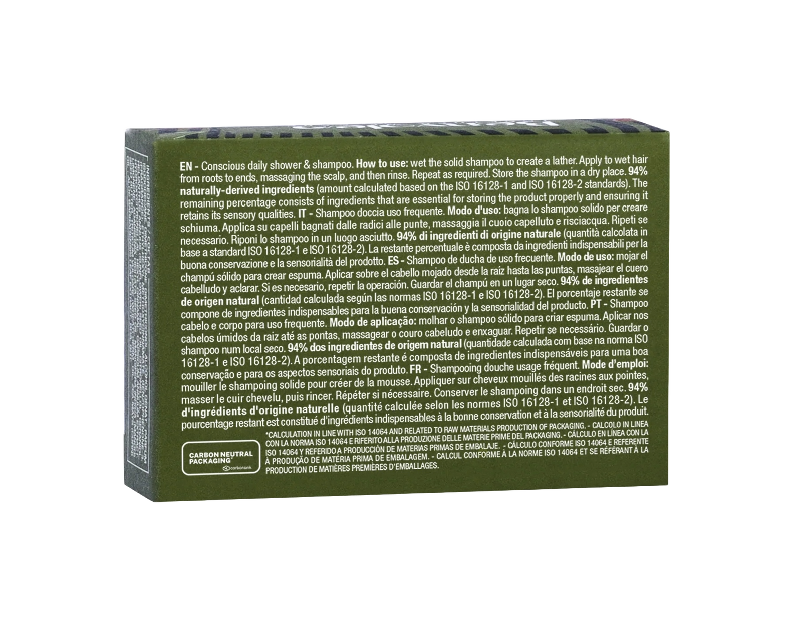 Wet the bar under warm water and rub between your hands to create a rich, creamy lather, or apply the bar directly to wet hair and skin. Massage gently into the scalp and over the body. Rinse thoroughly. To ensure the longevity of your Conscious Daily Bar, allow it to dry completely in a well-drained soap dish between uses.