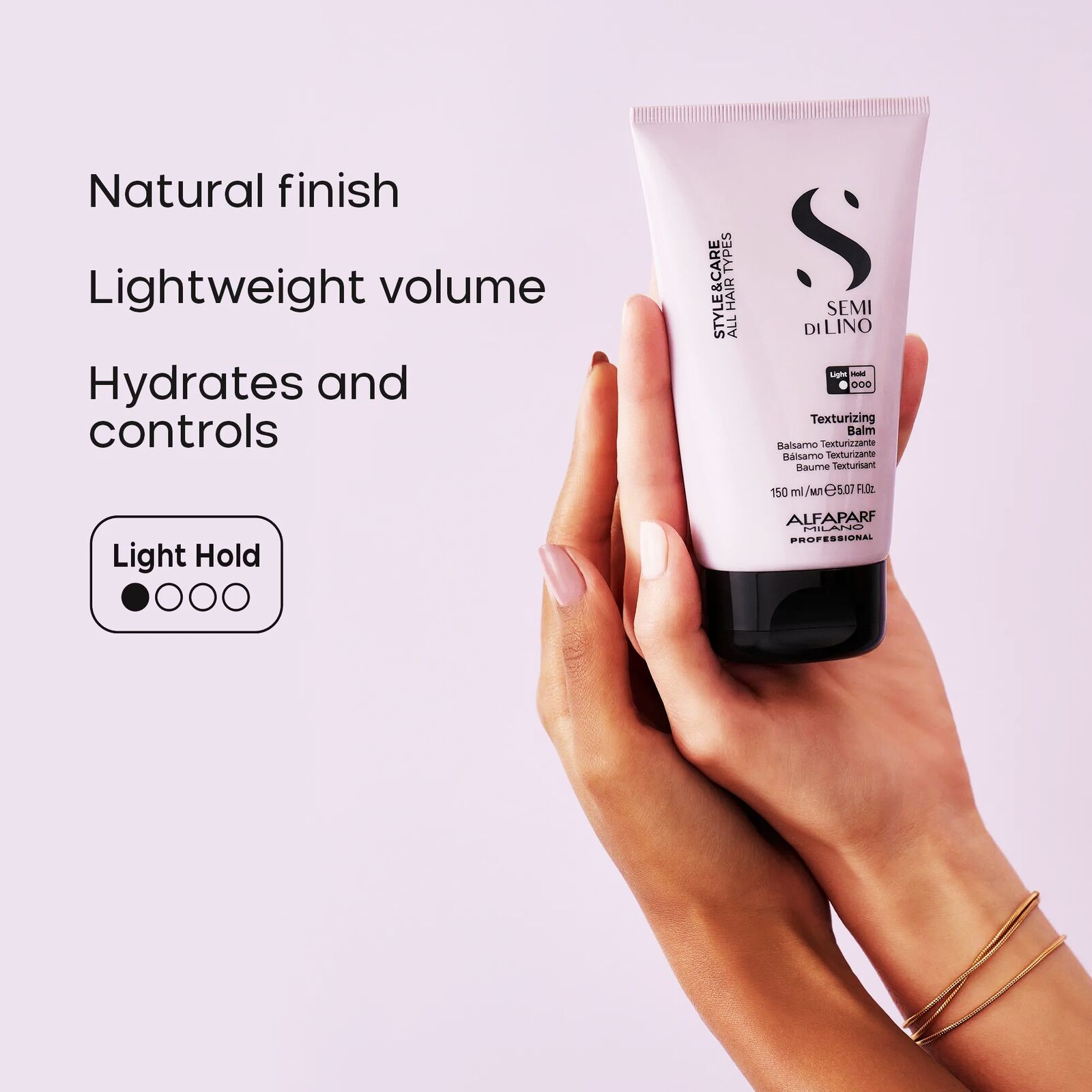 Alfaparf Semi Di Lino Style & Care Texturizing Balm is a lightweight styling cream that enhances natural texture while delivering hydration and soft volume. Designed for a “lived-in” look, it adds body and movement without stiffness or residue. The vegan formula offers thermal protection up to 230°C and features a delicate floral-fruity fragrance. Ideal for tousled waves, layered cuts, or beachy finishes, this balm provides flexible control and a matte finish that lasts.