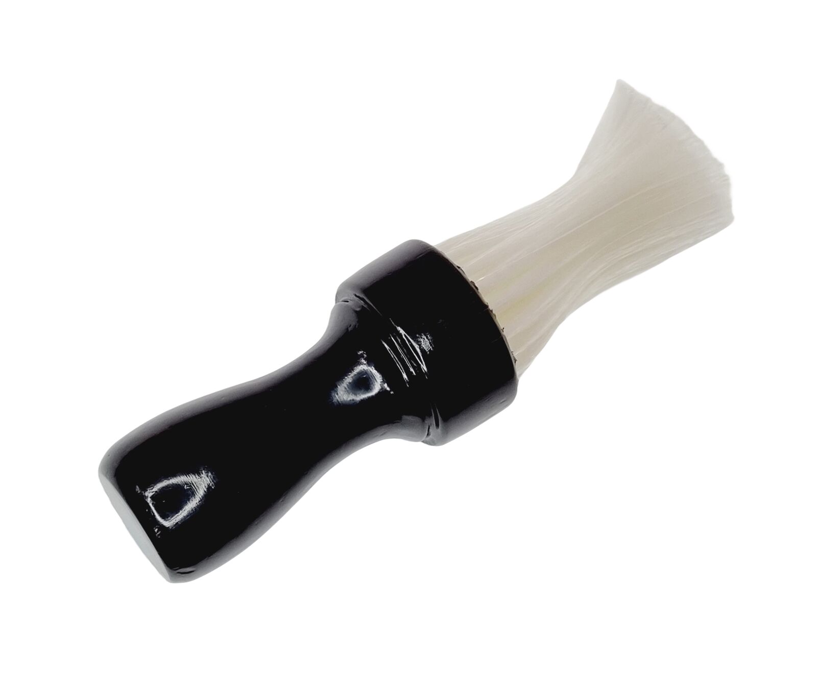 Hold the brush by the wooden handle and sweep gently across the neck, shoulders, and ears to remove loose hair. Clean regularly to maintain hygiene.