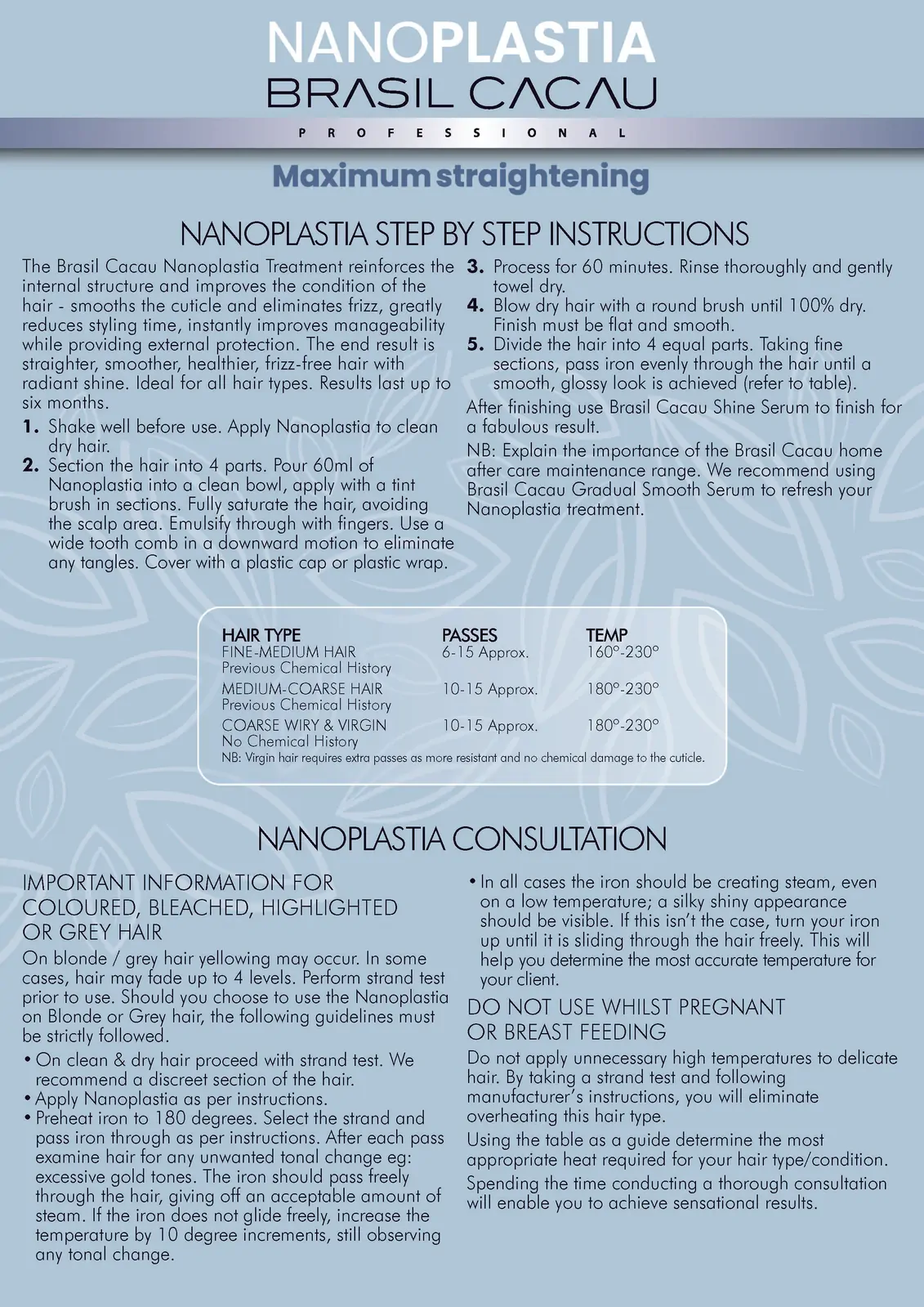 Ideal for clients seeking straight, smooth, and frizz-free hair with added strength and shine. Suitable for all hair types, including chemically treated and colour-treated hair.