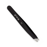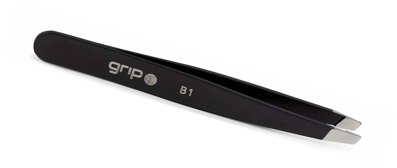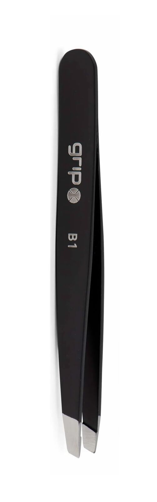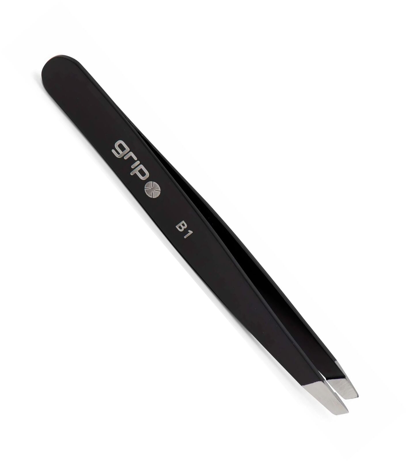 Constructed from durable surgical-grade stainless steel, this tweezer is finished in a sleek, non-reflective **Matt Black** coating for enhanced grip and professional appearance. The ergonomic "Grip" body design ensures superior comfort and stable control during use, minimizing slippage and hand strain. The precisely aligned slanted tips are perfectly calibrated to grasp hair firmly at the root every time, making it the ideal tool for all-purpose grooming, brow definition, and tackling tricky short hairs. The B1 Slanted Tip is the essential choice for reliable, accurate plucking.