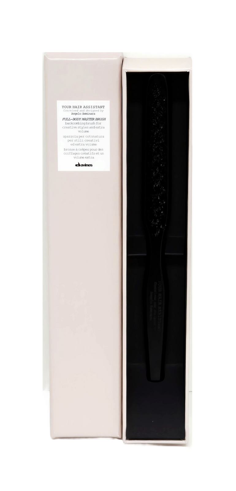 The Davines Full Body Master Brush is a professional teasing and backcombing tool designed to create volume, texture, and definition. Crafted with a blend of boar and nylon bristles, it grips hair securely while minimizing damage and breakage. The ergonomic handle ensures precise control, making it ideal for updos, root lift, and editorial styling. Part of the Your Hair Assistant collection by Angelo Seminara, this brush delivers salon-quality results with every stroke.