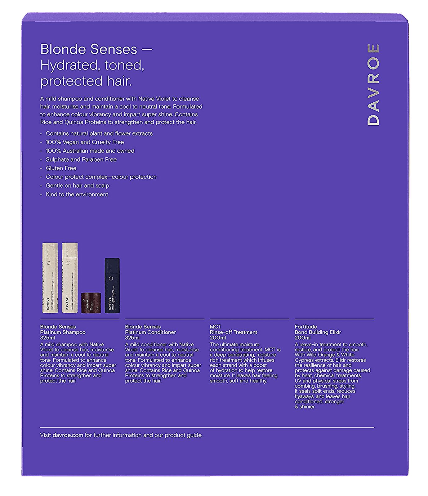 The Davroe Blonde Senses Quad Pack is a complete toning and strengthening haircare system designed to deliver brighter, healthier blonde hair. This set includes Blonde Senses Toning Shampoo (325ml), Blonde Senses Toning Conditioner (325ml), MCT Moisture Conditioning Treatment (200ml), and Fortitude Bond Building Elixir (50ml). Enriched with natural plant-based ingredients, violet pigments, and bond-strengthening complexes, the range gently cleanses, tones, nourishes, and rebuilds while protecting hair from environmental stressors. Ideal for blonde, highlighted, or grey hair, this quad pack provides salon-quality tone correction, hydration, and resilience.