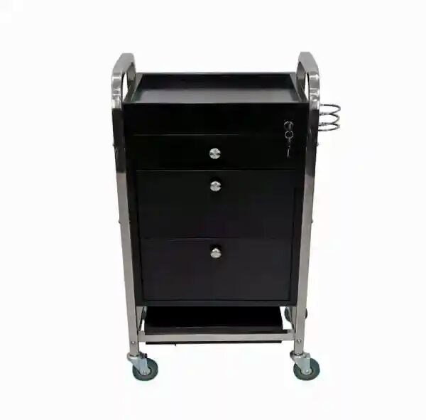 Upon arrival, ensure the castor wheels are securely attached to the base. Organize your tools into the five removable drawers based on frequency of use. Use the integrated top tray for active styling sessions. To maintain the finish, wipe down the metal surfaces daily with a damp cloth and mild detergent to remove product residue. Periodically check the lock mechanism and wheels for smooth operation. Ensure the trolley is locked at the end of each shift to secure your equipment.