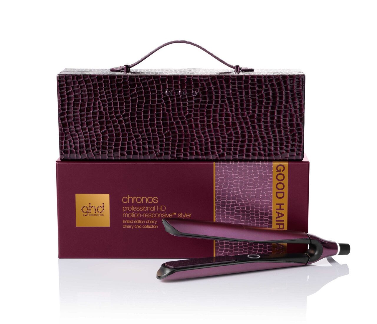 Step into a season of high-glamour styling with the ghd cherry chic collection - a celebration of seductive shine, elevated performance, and timeless beauty. Wrapped in a deep, rich cherry hue, the limited-edition ghd ChronosTM professional HD motion-responsiveTM hair straightener embodies the essence of luxury styling, accompanied by a travel-inspired vanity case* that turns every touch-up into a moment of indulgence.