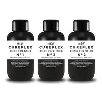 Mix No.1 Bond Creator into chemical formula. Rinse and apply No.2 Bond Fortifier for 5–10 minutes. Recommend No.3 Bond Sustainer for weekly at-home use. Follow Cureplex protocol for best results.