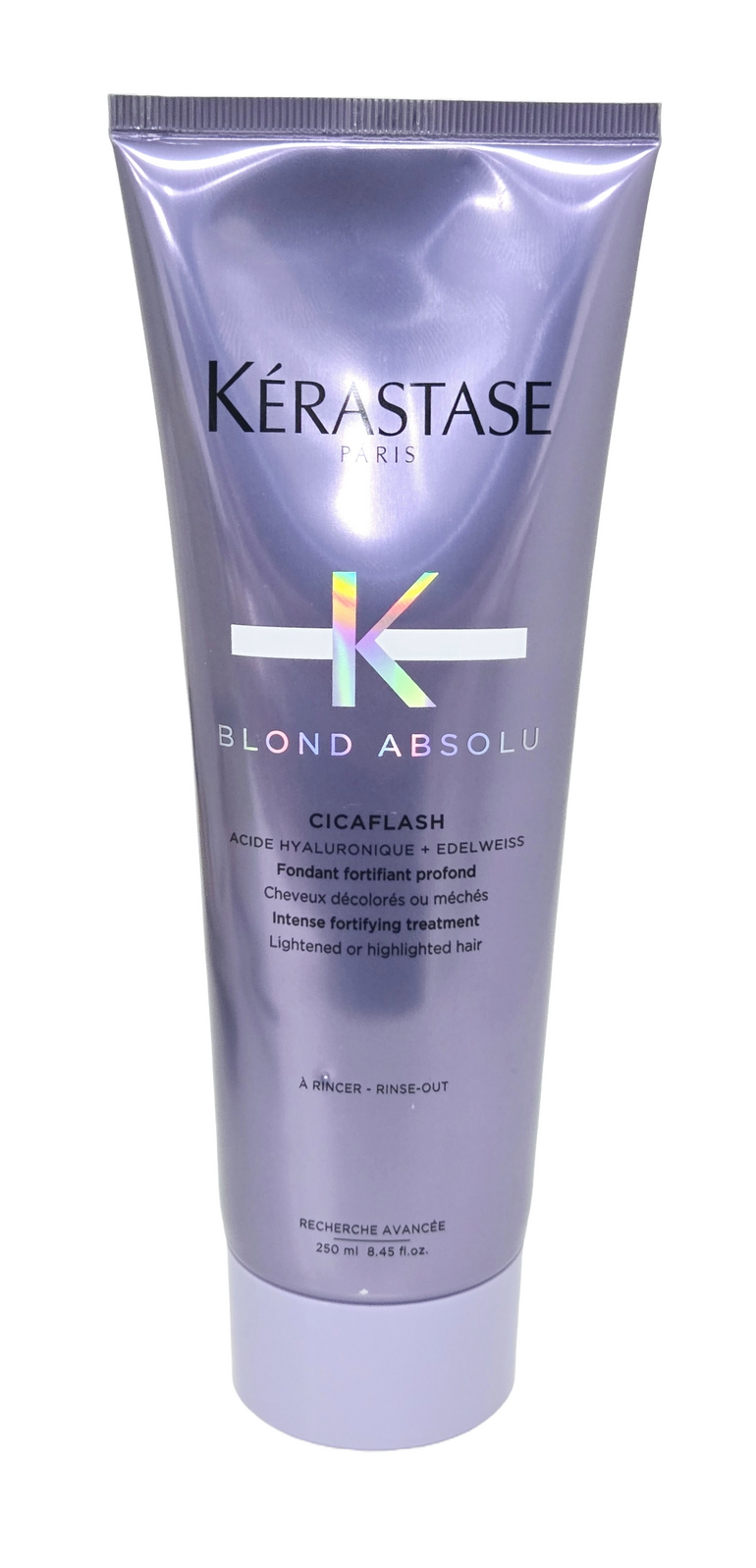 Kérastase Blond Absolu Cicaflash Fondant Conditioner is a luxurious hybrid treatment that delivers the restorative performance of a masque with the lightweight finish of a conditioner. Formulated with Hyaluronic Acid to hydrate and plump the fibre, and Edelweiss Flower to protect against daily damage, it instantly strengthens, smooths, and softens sensitised blonde hair. The opalescent lavender gel texture nourishes without weighing down, leaving hair silky, luminous, and resilient. Ideal for use after Bain Lumière or Bain Ultra-Violet shampoos.
