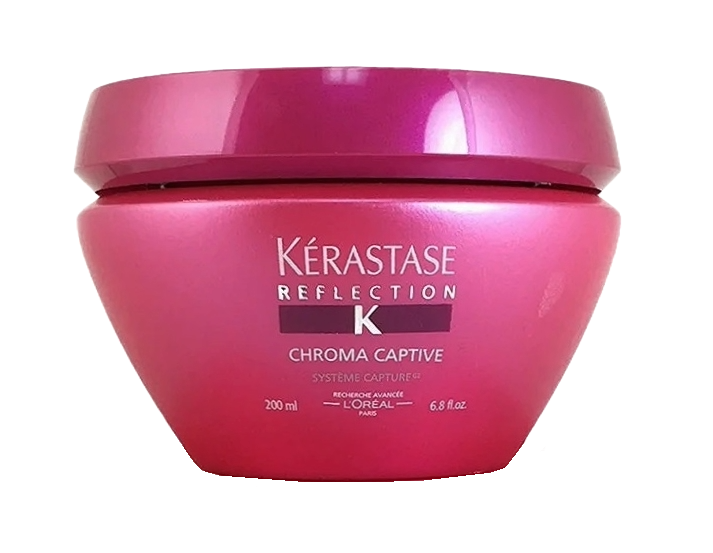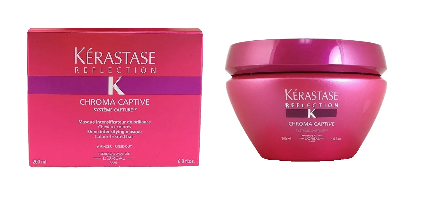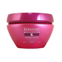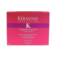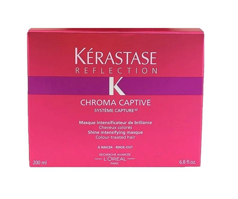 Kérastase Reflection Chroma Captive Masque is a luxurious treatment for colour-treated hair, formulated to preserve colour depth and shine for up to 40 days when used with the full Chroma Captive system. Enriched with Linseed Oil and UV filters, it helps reduce colour fading by up to 50% while protecting against environmental aggressors. The masque smooths and polishes the hair fibre, enhancing light reflection and leaving hair soft, radiant, and vibrant. Ideal for medium to thick hair textures seeking long-lasting colour brilliance and nourishment.