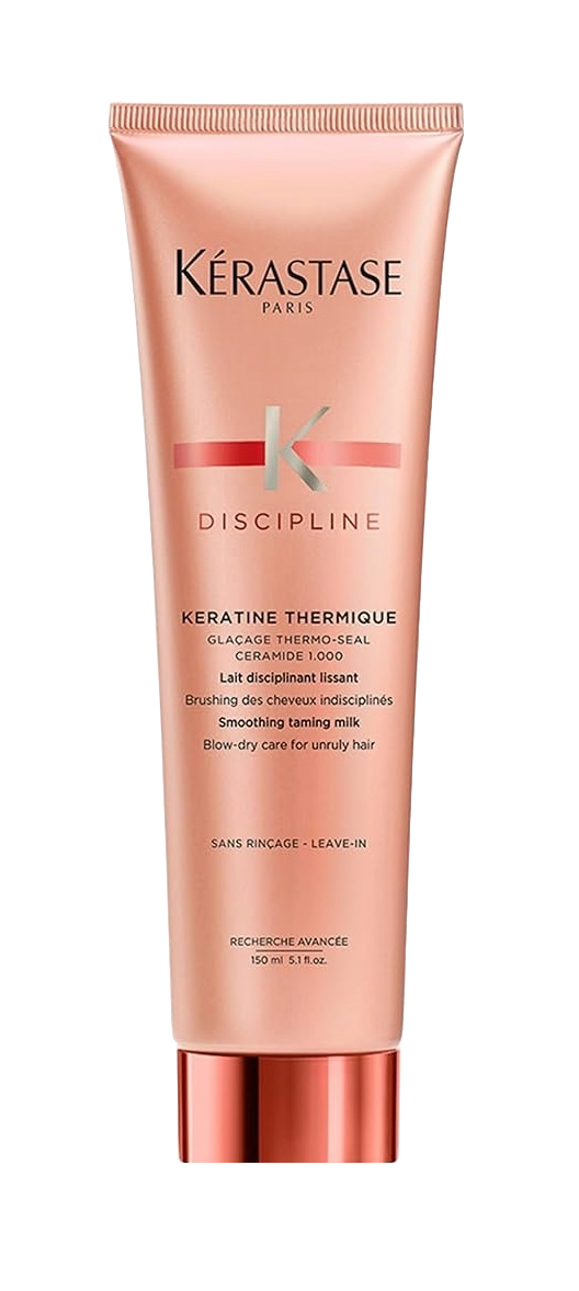 Kérastase Discipline Keratine Thermique is a leave-in blow-dry milk designed to smooth and protect unruly hair. Enriched with Morpho-Keratine™ and Ceramides, it strengthens the hair fibre, seals the cuticle, and reduces breakage. This thermo-protective formula shields hair from heat styling tools up to 180°C, while taming frizz and flyaways for a polished, fluid finish. Hair becomes easier to style, more manageable, and visibly shinier. Ideal for use before blow-drying or heat styling.