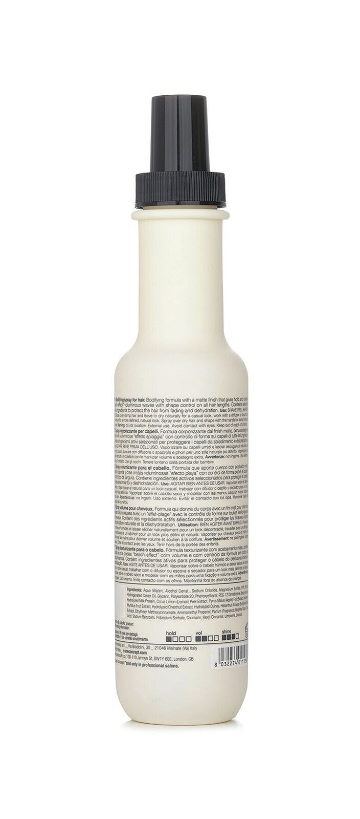 milk_shake Lifestyling Texturizing Spritz is a bodifying spray that adds volume, texture, and shape control to all hair types. Its lightweight formula creates matte-finish, beach-effect waves with flexible hold. Enriched with quinoa proteins, organic fruit extracts (apple, lemon, blueberry), and chestnut extract, it protects against colour fading, heat damage, and dehydration. Ideal for fine hair, this spritz enhances manageability and shine without weighing hair down. Use on damp or dry hair for casual texture or defined styling.