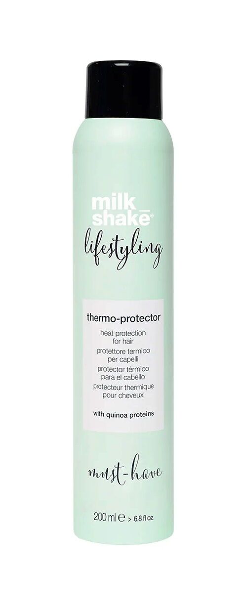milk_shake Lifestyling Thermo-Protector is an ultra-fine mist designed to shield hair from the damaging effects of heat styling tools. Its lightweight formula creates an invisible film over the hair fibre, helping prevent split ends, breakage, and dehydration while reducing drying time. Enriched with quinoa proteins, silk proteins, and milk proteins, it strengthens and protects hair structure while enhancing shine and manageability. Ideal for use before blow-drying, straightening, or curling, this spray leaves hair smooth, healthy, and protected.