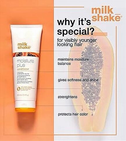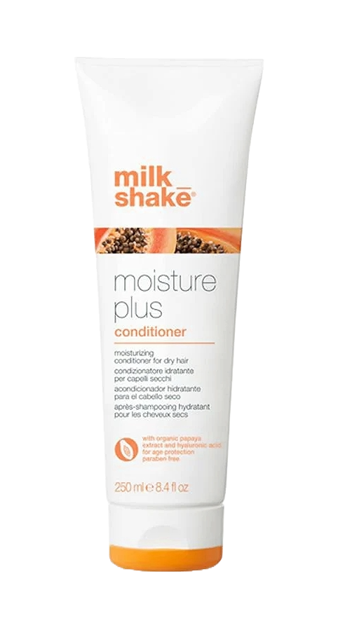 milk_shake Moisture Plus Conditioner is a hydrating, anti-aging formula designed to restore softness, manageability, and moisture balance to dry or dehydrated hair. Enriched with organic papaya extract, Integrity 41® (sunflower seed antioxidant), hyaluronic acid, and milk proteins, it detangles and smooths while protecting colour vibrancy. This paraben-free conditioner improves elasticity, reduces frizz, and leaves hair silky, radiant, and delicately scented. Ideal for daily use or as part of a moisture-repair routine.