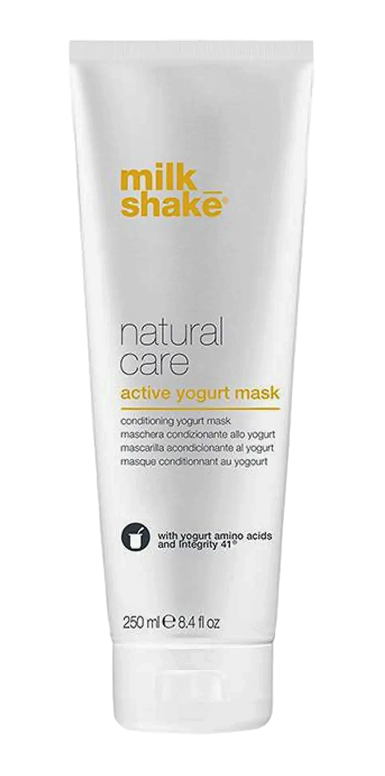 milk_shake Natural Care Active Yogurt Mask is a rich, restructuring treatment designed to deeply nourish and strengthen dry, damaged, or colour-treated hair. Formulated with yogurt amino acids, avocado and rice oils, honey and fruit extracts, vitamin E, and Integrity 41® (sunflower seed antioxidant), it binds to the hair structure to restore body, softness, and shine. This creamy mask conditions the hair shaft, improves manageability, and extends colour vibrancy. Ideal for weekly use or as needed to revive stressed strands.