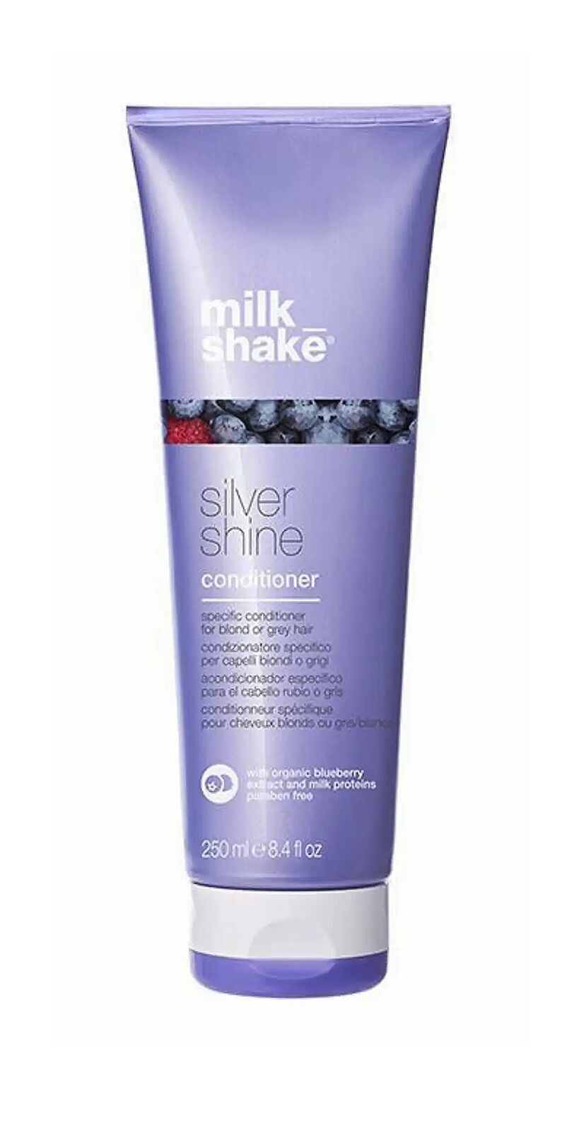 milk_shake Silver Shine Conditioner is a violet-pigment conditioning cream designed to neutralise unwanted yellow, golden, or brassy tones in blonde, grey, white, or lightened hair. Enriched with milk proteins, organic fruit extracts, and Integrity 41® (sunflower seed antioxidant), it hydrates, detangles, and enhances colour vibrancy while maintaining moisture balance. This paraben-free formula leaves hair soft, luminous, and full of vitality with a fresh berry scent. Ideal for use after Silver Shine Shampoo to maintain cool tones between salon visits.