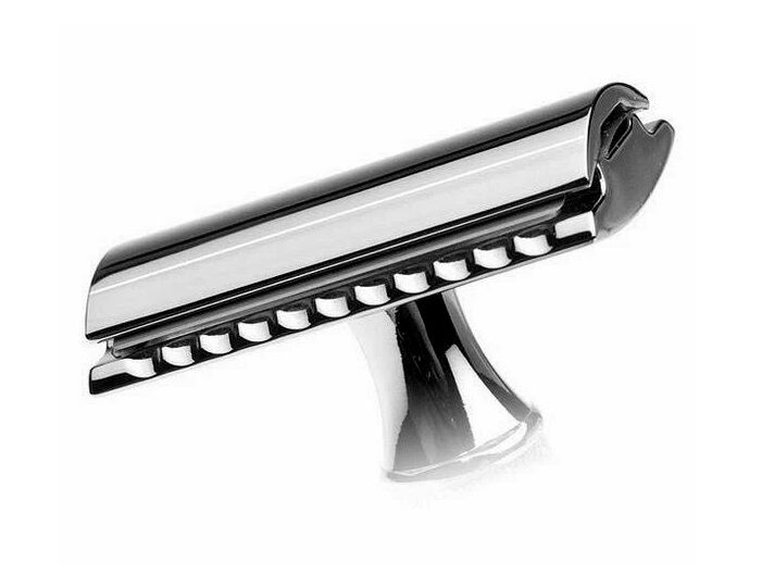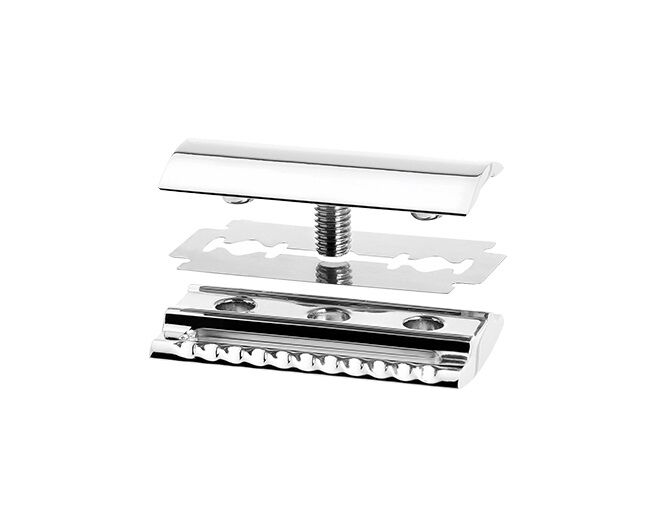 Unscrew the razor head and insert a double-edge blade. Apply shaving cream or soap. Shave with short, light strokes. Rinse thoroughly and dry after use.