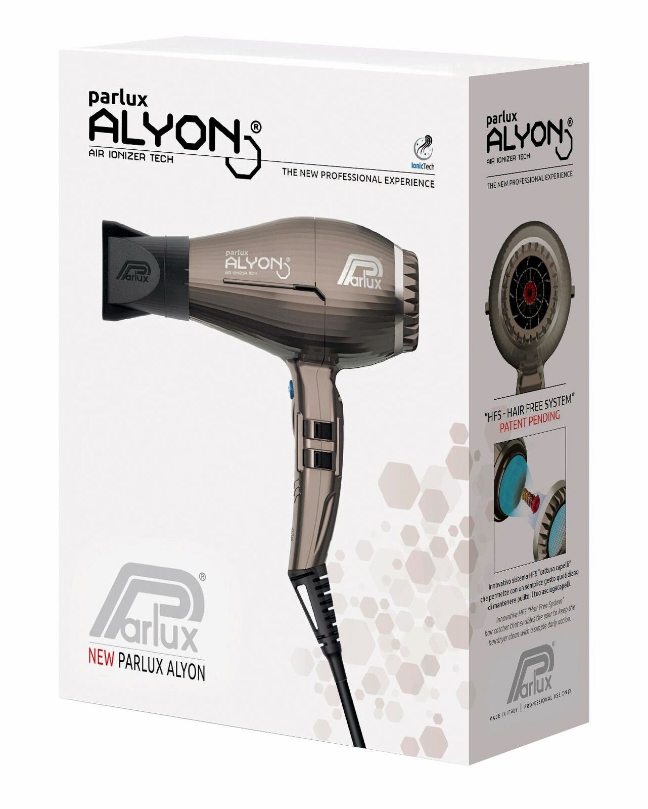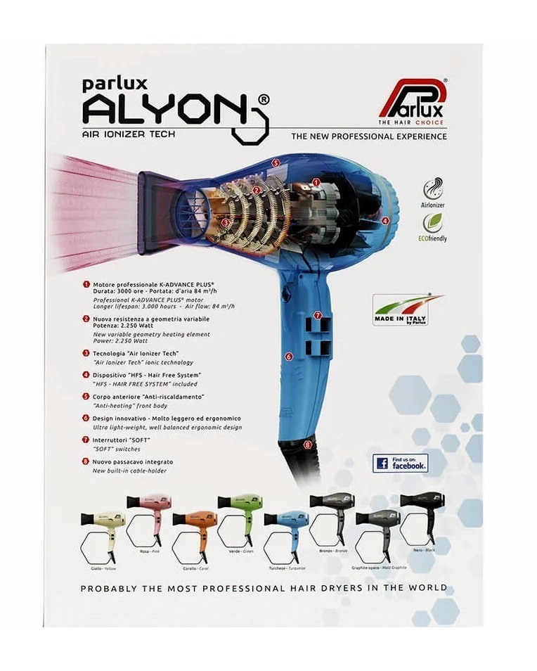 The Parlux Alyon Bronze Hair Dryer is engineered for professional performance and long-term durability. Featuring the advanced K-Advance Plus motor, it delivers 2250 watts of power and an airflow of 84m³/h for ultra-fast drying. The Air Ionizer Tech neutralizes static and enhances shine, while the antibacterial casing embedded with silver particles helps maintain hygiene. Lightweight, ergonomic, and heat-resistant, the Alyon is built for comfort and control. Includes two precision nozzles for styling versatility.