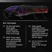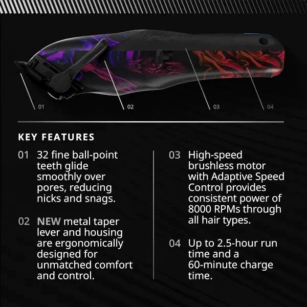 Each Vapor™ clipper features a one-of-a-kind hydro-dip design and soft-touch finish no two units are alike. The patent-pending F32 blade boasts 32 fine ball-pointed teeth and deeper grooves for consistent feeding and rapid, snag-free cutting across all hair types.